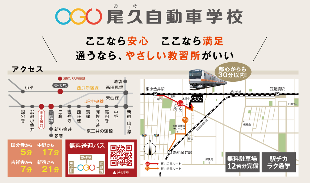 JR中央線[東小金井駅]から駅チカです!(送迎バスも完備)都内で一番歴史があり、数多くの教習生を安全運転のできる素敵なドライバーにしてきました!地域最大級の広さを誇り、直線コースは約170mあります。変速操作(MT車)や加速、減速等もしっかりと練習できますよ!